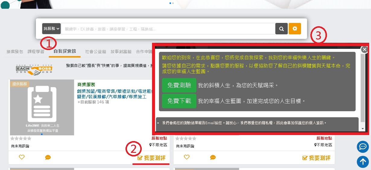 A13 : 【自我探索館】可在平台首頁的搜尋欄位下方中找到此館別頁籤,點選此館別後,即可在每個服務分類中點選【我要測評】來進行自我探索找尋人生目標的服務,此服務皆為免費,希望藉由此館別的服務,能夠協助會員發掘自己較"擅長"與"快樂"的事,提高實現價值,擁抱幸福快樂人生。